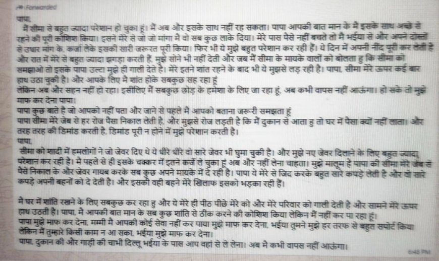 बताया जाता है कि इस बीच उसने अपने पिता को फोन पर मैसेज के जरिये पत्नी सीमा द्वारा की जा रही प्रताडना की पूरी कहानी से अवगत कराते हुए दुकान की चाभियों की जानकारी दी थी। संदेश मे उसने कहा है कि वह अपनी पत्नि से परेशान हो चुका है और अब कभी वापस नहीं आयेगा। इतना ही नहीं युवक ने अपने पिता, माता और भाई से इसके लिये माफी भी मांगी है। बताया जाता है कि अभिषेक गुप्ता का विवाह साल 2023 मे ताला की सीमा गुप्ता के सांथ हुआ था। तभी से उनके बीच मे कुछ ठीक-ठाक नहीं चल रहा था। बीती 16 अक्टूबर को अभिषेक ने पत्नि की प्रताडना से जुडी एक सूचना थाना कोतवाली मे भी दी थी। अभिषेक के बारे मे जो जानकारी सामने आई है, उसके मुताबिक वह बेहद भावुक, सीधा और मिलनसार व्यक्ति था। परिवार को डर है कि कहीं भावावेष मे वह कोई गलत कदम न उठा ले।